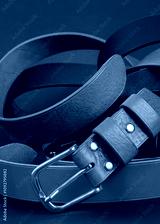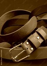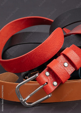 Part of red leather belt with metal buckles close-up on dark grey background.