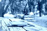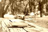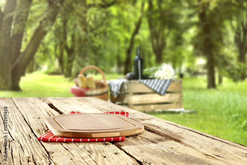 Wooden cutting board on wooden surface with picnic setting in the green spring park.