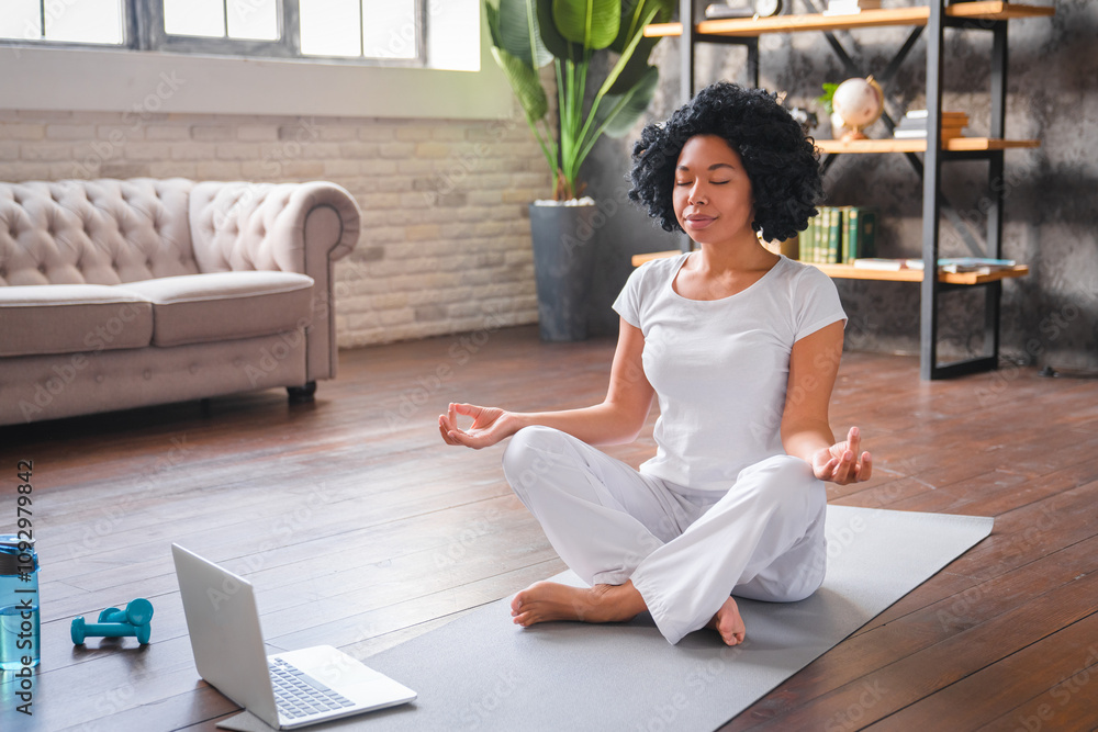 Woman meditating and practicing yoga at home. Training, fitness, workout, meditation, yoga, self-care, relaxation exercises, mindfulness, healthy lifestyle, recreation concept