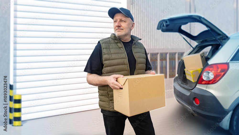 Man with box near warehouse and car. Guy puts cardboard parcels in trunk. Business owner picks up goods from warehouse. Man smiles holding box. Businessman stands near industrial hangar with gate