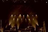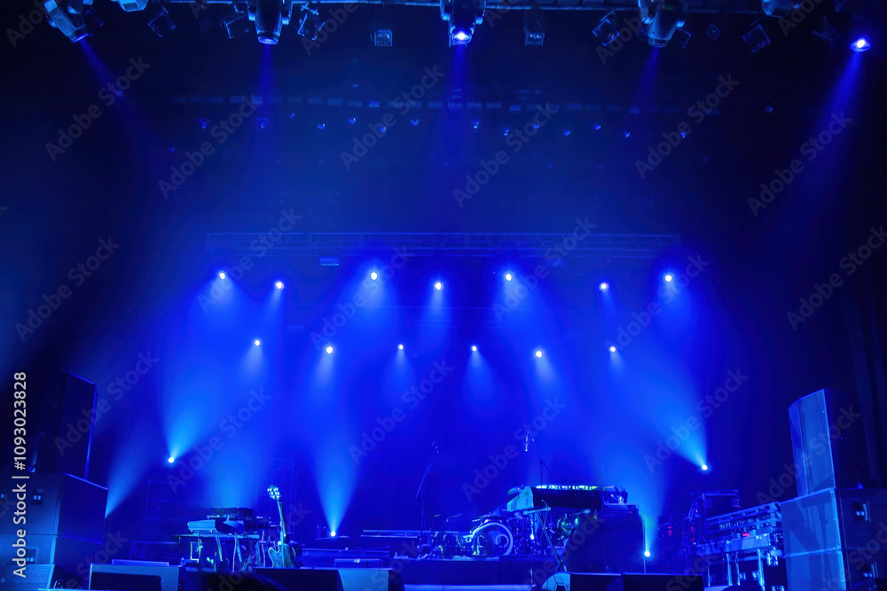 Empty concert stage. Musical instruments for rock concert. Stage awaits start of singers performance. Concert background with blue neon light. Empty stage after musicians leave for break