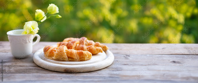 Fresh Crisp croissants served on wooden board, greenery background and coffee cup flower, peaceful outdoor café setting, Garden bistro charm