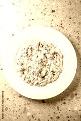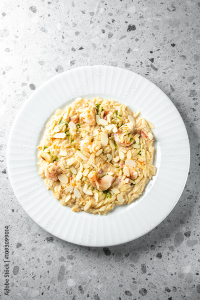 Creamy risotto with shrimps, parmesan cheese and thyme in white ceramic plate decorated with almond slices