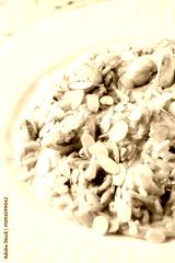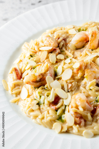 Creamy risotto with shrimps, parmesan cheese and thyme in white ceramic plate decorated with almond slices