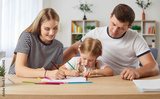 Family home education, happy preschooler quarantine homeschooling parents and daughter learning distant class with happy small child helping to write, study on homeschooling, doing homework together