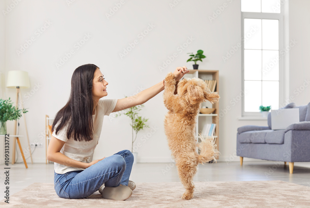 Happy beautiful young woman playing with cute puppy dog at home smiling, laughing, relaxing in cozy modern living room interior, funny pet cuddling, spending weekend leisure, joyful fun moment