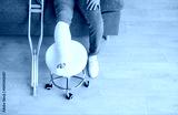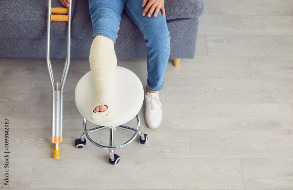 Close-up of the image of crutches and broken leg in a plaster cast. Young man with an injured leg and foot sitting on the couch at home, with his foot resting on a stool. Cropped shot, top view.