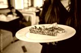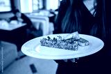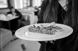 Close-up of a gourmet tartare dish with toast, served on a white plate by a person in a restaurant setting. The elegant presentation highlights the fine dining experience