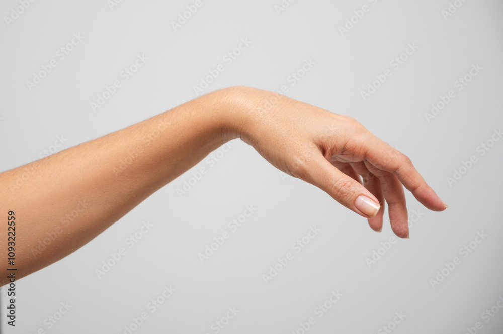 Close-up of an elegant female hand with neutral nail polish against a plain background, showcasing graceful fingers and smooth skin.