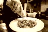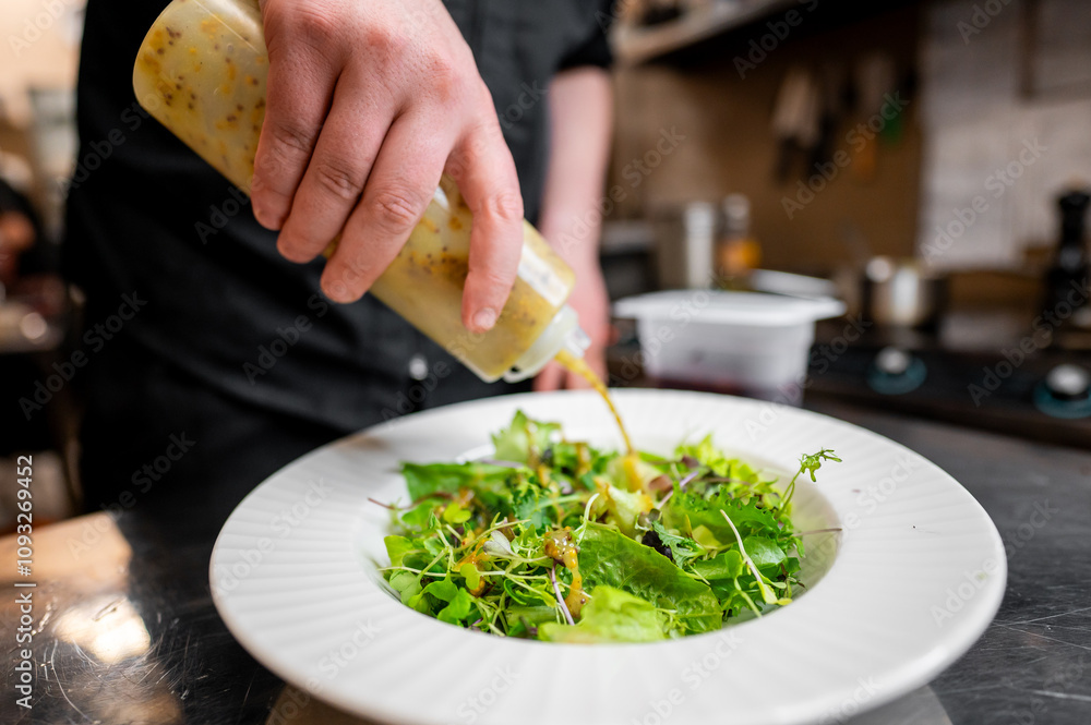 A chef’s hands drizzling dressing over a fresh green salad on a white plate, with a blurred kitchen background. Perfect for culinary, cooking, and food preparation themes.