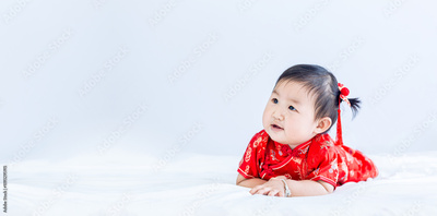 Asian baby girl in red chinese new year dress isolated on white background,Cute Asian baby girl in traditional Chinese suit Isolated on white background, Chinese New Year Concept