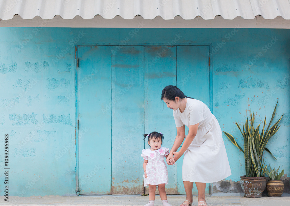 Mother and daughter walk hand in hand,family, child, childhood and parenthood concept - happy little baby learning to walk with mother help at home