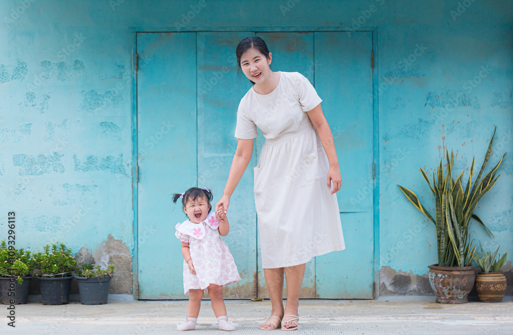 Mother and daughter walk hand in hand,family, child, childhood and parenthood concept - happy little baby learning to walk with mother help at home