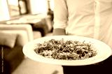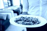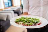 A person in a white shirt holds a plate of food topped with arugula. The background is blurred, emphasizing the dish. Ideal for culinary, lifestyle, or restaurant-themed stock photos.