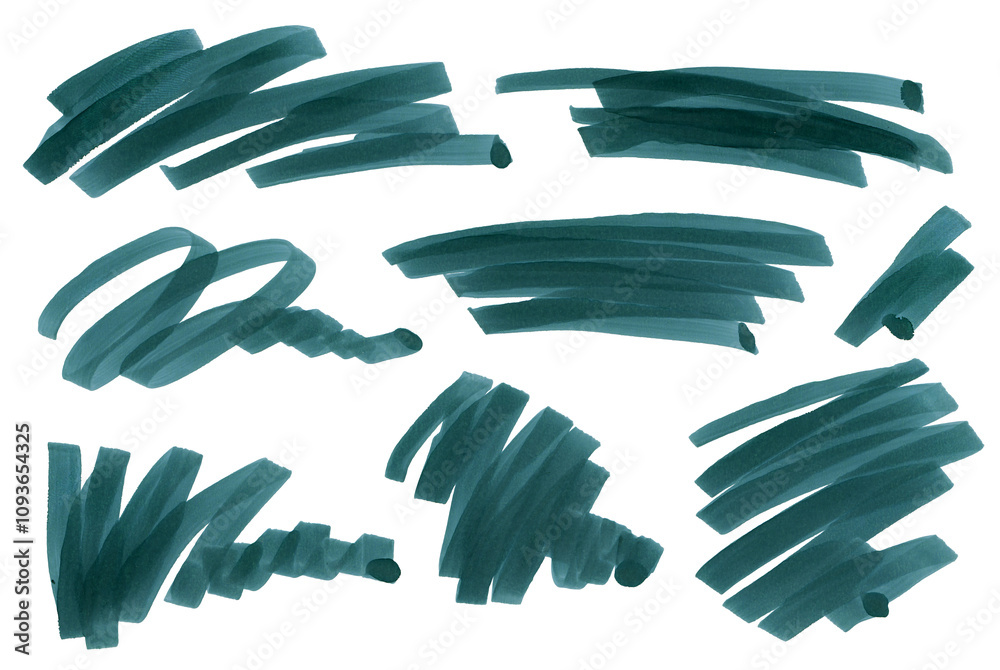 Hand drawn sketch hatching line smear stroke. Felt-tip pen, watercolor marker texture stain isolated on white background. Blue color. Set.