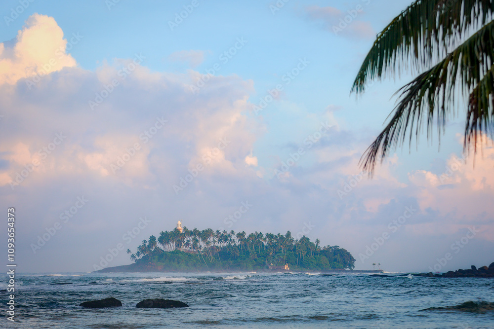 A beautiful view of the island with a lighthouse opposite Beruwala beach at sunrise. Sri Lanka
