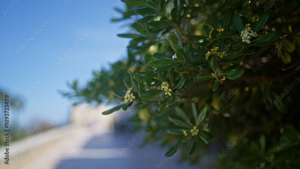 A close-up of a flowering phillyrea angustifolia, found in an outdoor setting in puglia, italy, with green leaves and blurred background.