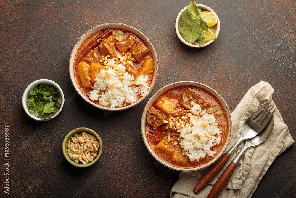 Two bowls of delicious massaman curry with peanuts, rice, herbs, lime, and spices on a brown background top view, dish of Thailand