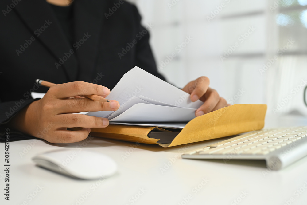 Professional businesswoman in a formal suit reviewing documents at a desk