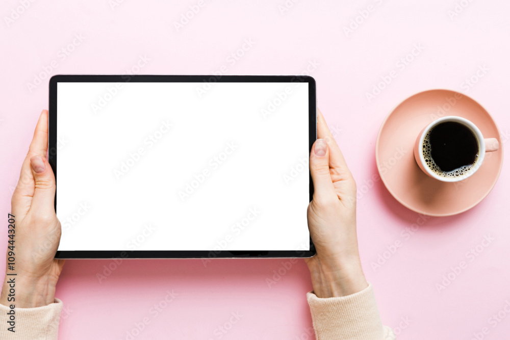 Close up image woman hands holding digital tablet with blank copy space screen for your text message or promotional content om table with cup of coffee. hands of a woman holding blank tablet device