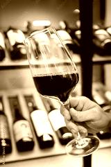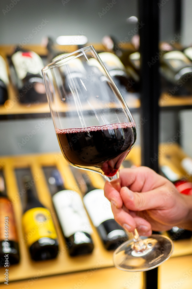 A close-up of a hand holding a glass of red wine, with a blurred background of wine bottles on shelves. The image captures the elegance and sophistication of wine tasting