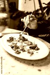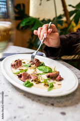 A hand holding a fork, poised to enjoy a gourmet dish with sliced meat and fresh greens on a white plate, suggesting an upscale dining experience. Perfect for culinary, dining, and lifestyle themes.