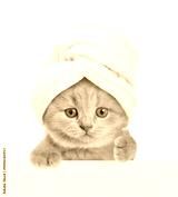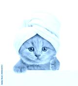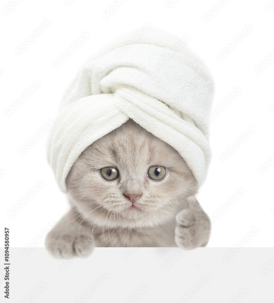 Cute kitten with towel on it head looks above blank white banner and shows thumbs up gesture. isolated on white background