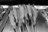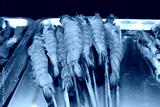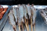 blurred and defocus Chinese fresh raw shrimp skewers placed in stainless steel tray at local street food market , Chengdu, Sichuan, China