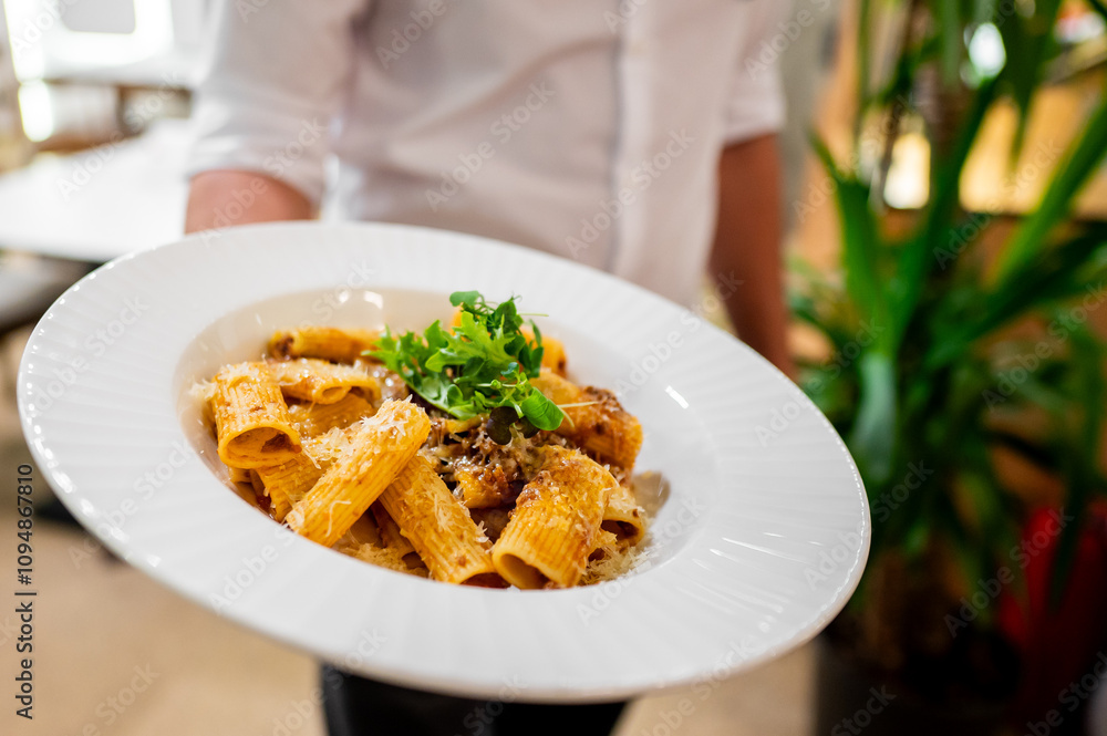 A person holding a plate of delicious pasta in a modern dining environment. The dish features rigatoni with sauce and garnished with fresh herbs, showcasing a cozy atmosphere.