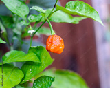 White flower and red ripe Carolina Reaper chili pepper ready to harvest at backyard garden in Dallas, Texas, world second hottest chili, Capsicum chinense plant developed by American breeder