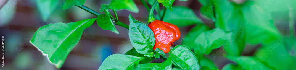 Panorama view ripe Carolina Reaper chili peppers ready to harvest at backyard garden, Dallas, Texas, world second hottest chili, cultivar of Capsicum chinense plant developed by American breeder