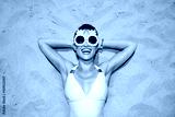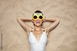 Smiling woman in swimsuit and pineapple glasses laying on sand