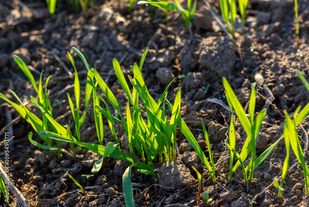 Tender wheat sprouts emerge from the rich, dark soil, their green tips reaching toward the warm sunlight. The sunlight casts a gentle glow, symbolizing growth and new beginnings.