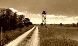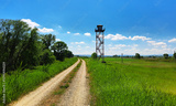 A rural watchtower stands tall beside a winding dirt road surrounded by lush green fields and trees under a vibrant blue sky with scattered white clouds.