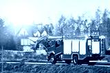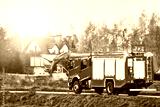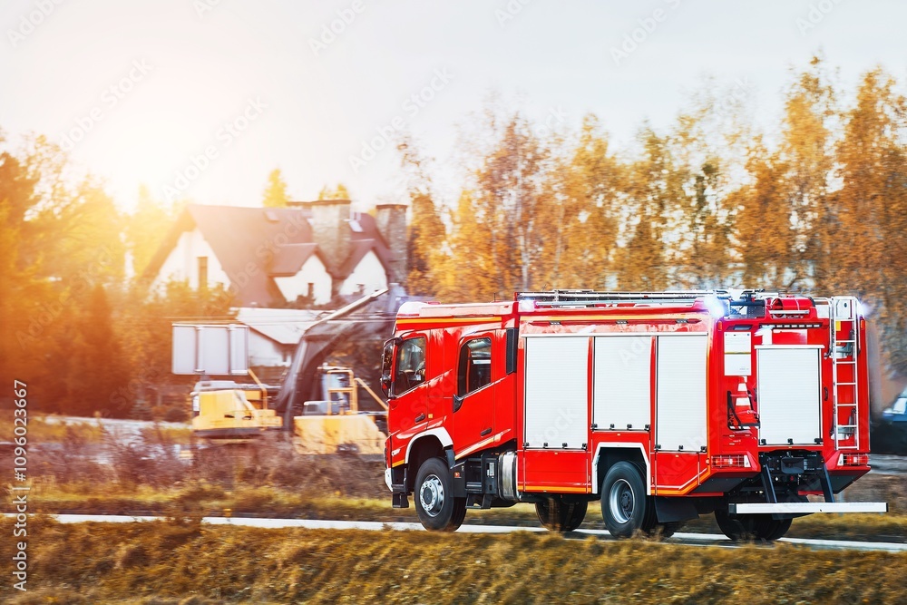 A firetruck rushes to the scene of a fire. The firefighters on board are prepared to save lives and put out the flames. The siren blares as the vehicle speeds through the city streets.