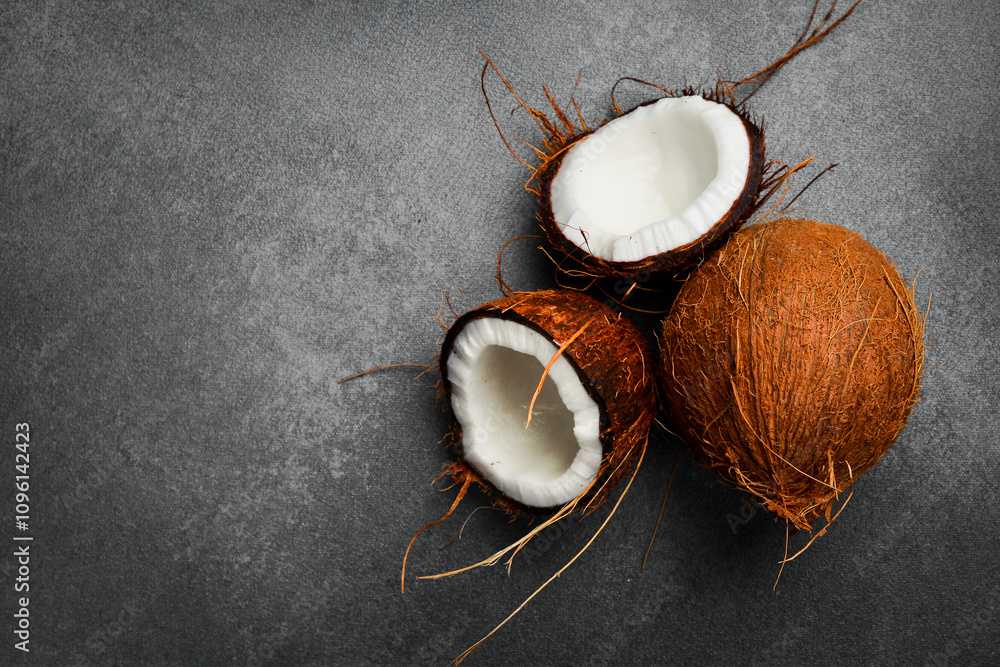 Fresh open coconuts. Tropical nuts close-up. On a dark background.