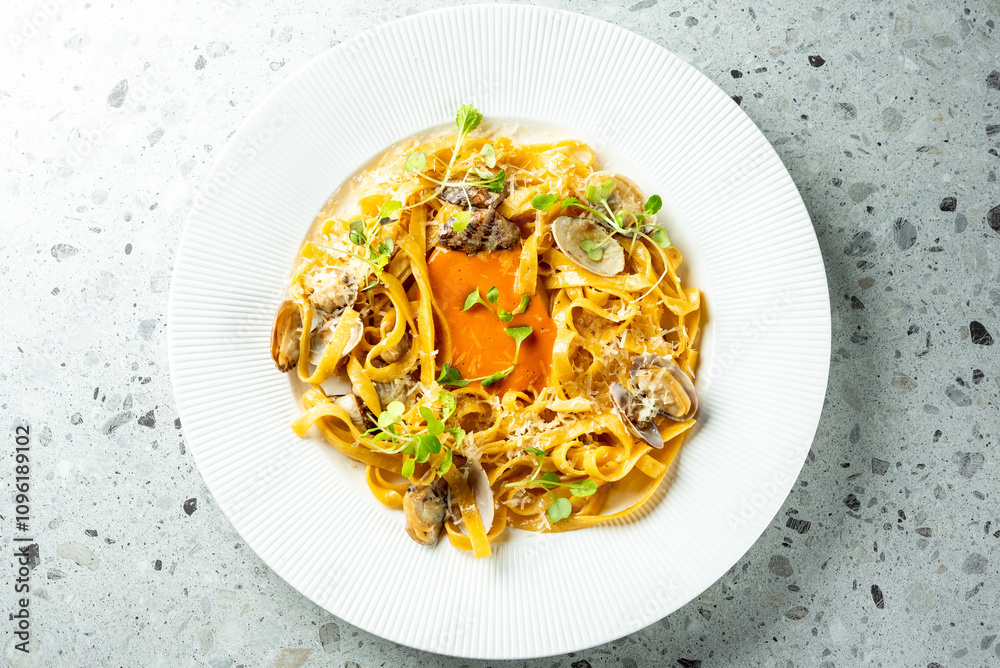 Plate of fettuccine pasta with seafood, garnished with herbs on a white plate