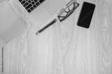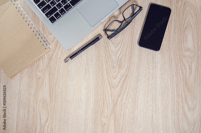 Desk table with working place elements. Top view with copy space.