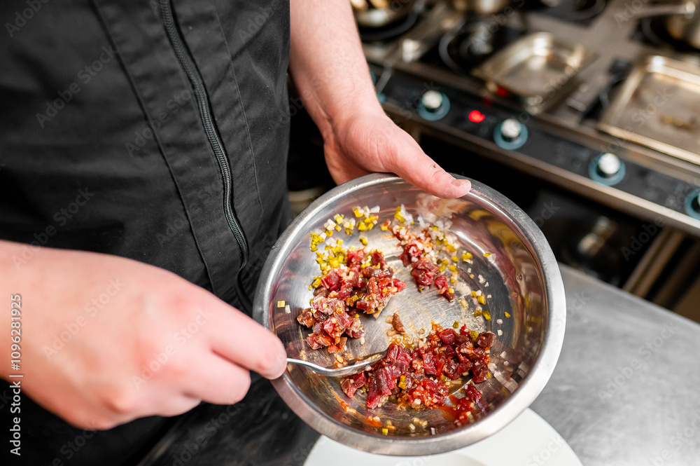 Close-up of a chef’s hands holding a stainless steel bowl with mixed colorful ingredients in a professional kitchen setting. Ideal for culinary themes, food preparation