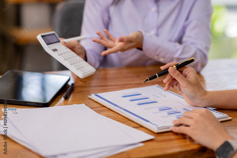 Financial Business two women analyze the graph of the company's performance to create profits and growth, Market research reports and income statistics, Financial and Accounting concept.