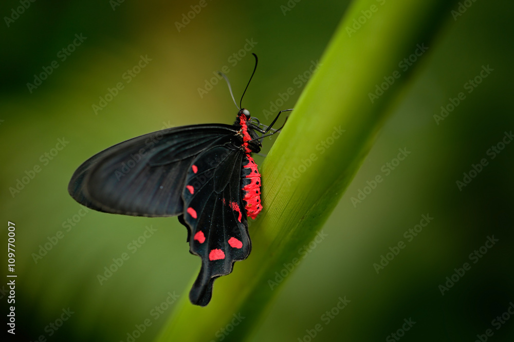 Beautiful black and red poison butterfly, Antrophaneura semperi, in the nature green forest habitat, wildlife, Indonesia