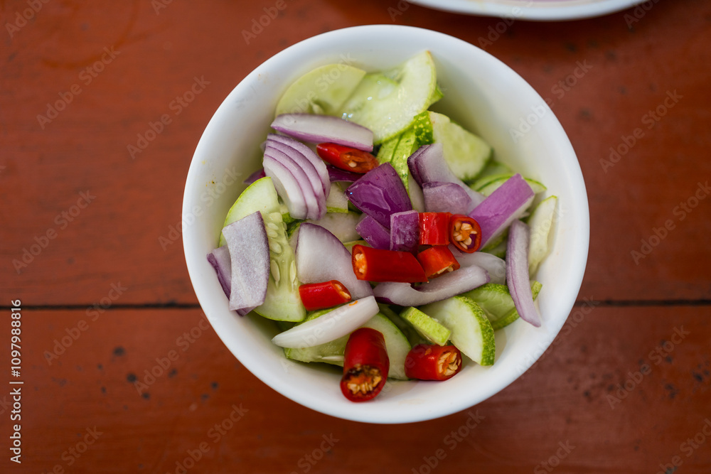 Ajad, or a side dish to eat with pork stew, is made from sliced cucumbers. Sugar simmered with vinegar Add chopped bell pepper and onion