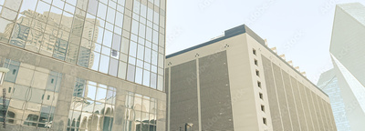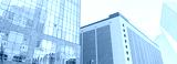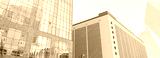Panorama upward view glass office building, skyscraper, high-rise condo towers under clear blue sky in downtown Dallas, Texas, urban architecture, leasing space commercial and business center