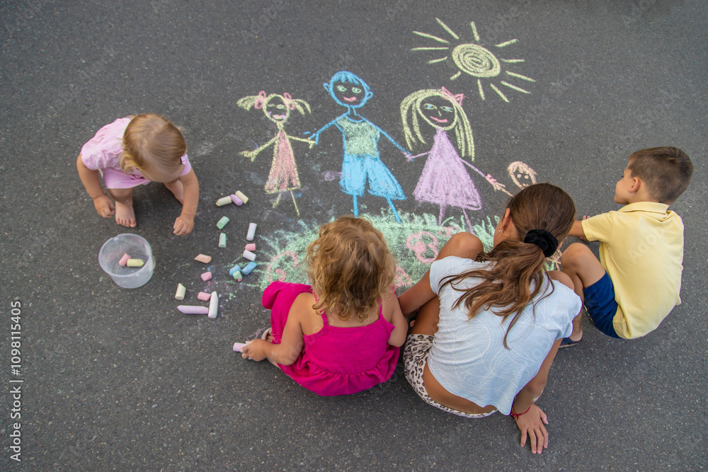 Children draw on the asphalt with chalk. Selective focus