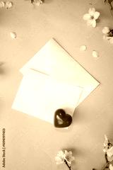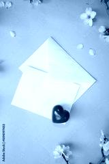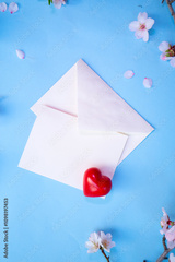 spring cherry and almond tree blossoming flowers over blue background with copy space on white blank letter