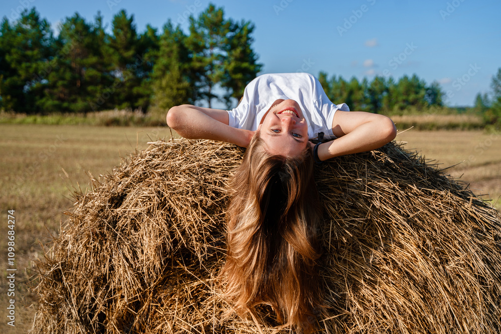 Young beautiful Caucasian girl in a field with round haystacks, countryside.