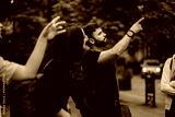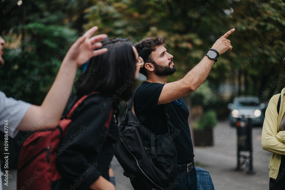 A professor guides a group of students during an outdoor learning experience. They are actively engaging with their surroundings in a natural setting, fostering teamwork and exploration.