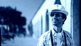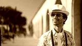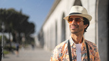 Tourist wearing sunglasses and hat smiling in urban setting