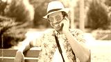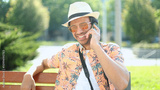 Tourist wearing sunglasses and hat talking on phone and smiling in park