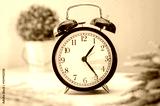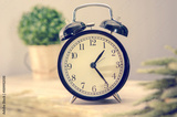 Close up black retro alarm clock on table, Spring Time, vintage style